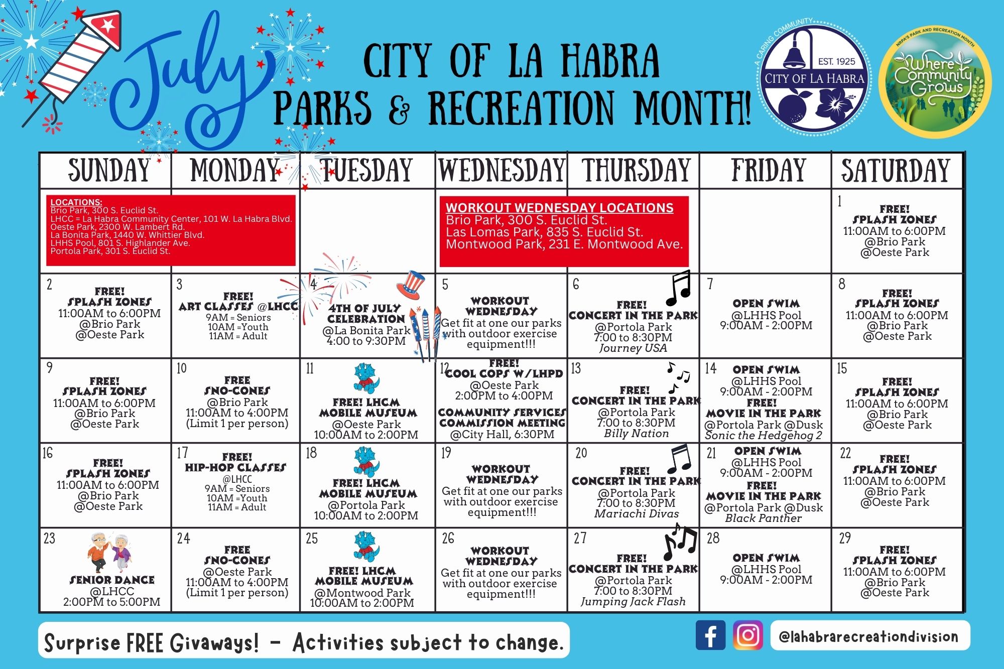 July is Parks & Recreation Month, and the La Habra Recreation Department will be offering free activities to celebrate at the Community Center and local parks. Activities will include free sno-cones, free art and hip-hop classes for all ages, workouts on exercise equipment at local parks, free La Habra Children's Museum Mobile Museum, free concerts in the park, splash zone fun, La Habra Police Department's "Cool Cops" event, a senior dance on Sunday, July 23rd,and Friday recreational open swim at the La Habra High School pool.